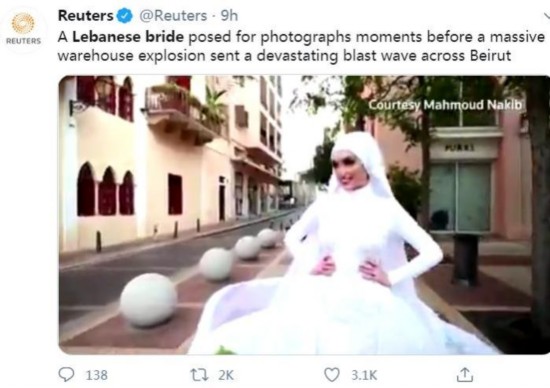 中新网8月6日电 据外媒报道,在黎巴嫩贝鲁特4日发生剧烈爆炸之际,29岁的新娘赛布拉尼正身着耀眼的白色礼服及头纱,容光焕发地进行着婚礼影片的拍摄。突然之间,一声震耳欲聋的声响传来,且随之而来的强大冲击波,让她几乎站不稳。