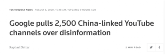 路透社在报道中称,谷歌并没有具体说明频道名称,也没有提供其他细节信息,只是将这些视频与推特发现的类似活动,以及社交媒体分析公司Graphika4月发现的虚假信息操作相关联。此外,这则公告还提及与伊朗和俄罗斯等其他国家有关的活动。