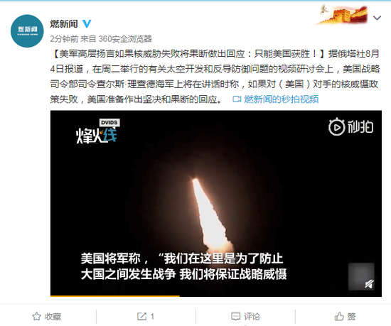 据俄塔社8月4日报道,在周二举行的有关太空开发和反导防御问题的视频研讨会上,美国战略司令部司令查尔斯·理查德海军上将在讲话时称,如果对(美国)对手的核威慑政策失败,美国准备作出坚决和果断的回应。