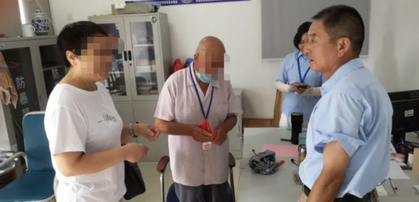 8月5日上午,在姜堰中医院物业办公室,一名女子激动得向医院物业人员连声道谢,旁边一名老人手握一只红布袋眼含热泪。