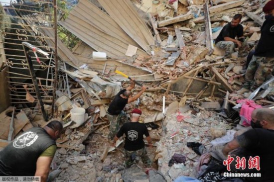 据法新社报道,黎巴嫩红十字会5日表示,贝鲁特港口发生的爆炸,共已造成100多人死亡。图为黎巴嫩士兵在废墟中搜索幸存者。