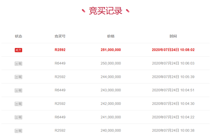 线上拍卖的同时,相关线下宣传也全力跟进。最终,此次拍卖共吸引5人参拍,从1.93亿元开始起拍,经过25轮激烈争夺,13次延时,最终拍出2.51亿元,整个拍卖过程吸引了2万多人次围观。