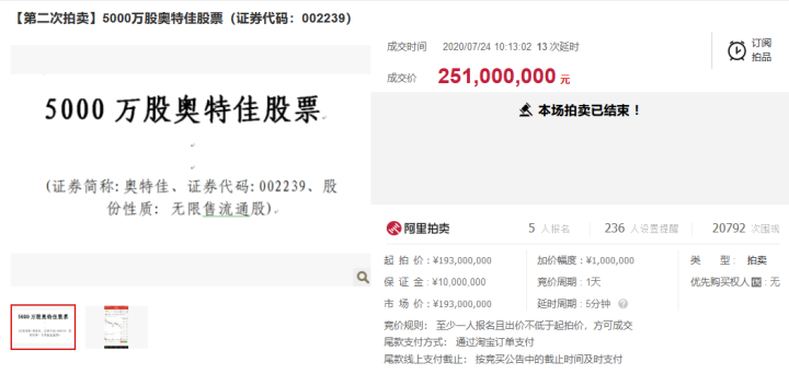 8月4日12时36分,南通市中级人民法院淘宝网司法拍卖指定账户收到买受人除去1000万保证金之外的2.41亿元拍卖尾款。这笔巨款,来自11天前对个人所持大宗股票的一次司法拍卖。7月24日10时13分,南通中院淘宝网司法拍卖平台上的5000万股奥特佳股票,在经历25次竞价后成功落槌,最终以2.51亿元成交,比市场价高出近6000万元,溢价率达30%。