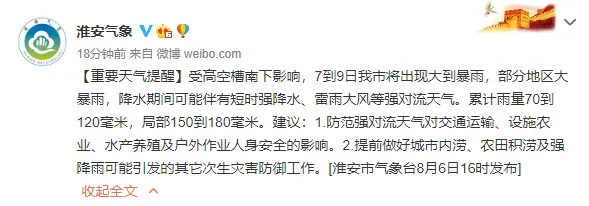 受高空槽南下影响,7到9日淮安市将出现大到暴雨,部分地区大暴雨,降水期间可能伴有短时强降水、雷雨大风等强对流天气。累计雨量70到120毫米,局部150到180毫米。