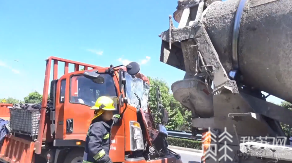 消防救援人员到场后发现,发生追尾的卡车车头已严重变形,水泥车搅拌桶的卸料槽由于受到撞击,已经撞破卡车前挡玻璃,伸入卡车驾驶室。被困的卡车司机面部受伤血流不止,并由于失血意识模糊,下半身也被变形的方向盘和车头紧紧卡住。