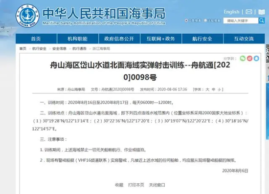 8月6日,中国海事局网站发布航行通告,通告称,8月11日至13日,舟山黄大洋海域实弹射击训练;8月16日至17日,舟山海区岱山水道北面海域实弹射击训练。