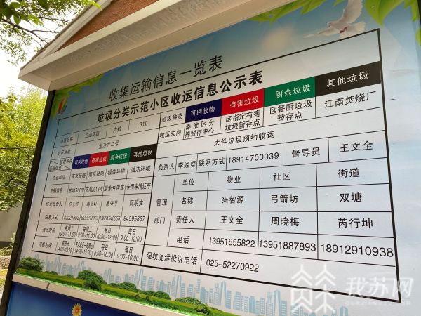 双塘街道垃圾分类办公室负责人芮行坤介绍,在“九个一”推进模式中,还包括“一表公示”、“ 一号监督”。“一表公示”是指,将垃圾分类收运信息明确公示,包括收运车辆号牌、责任人、联系电话、清运时间等内容,让大家明确知道垃圾的最终去向。“一号监督”就是要公示混收混运的投诉电话,居民一旦发现收运人员混装混运的现象,可以很方便的监督、投诉。这样一来,就可以更好地促进垃圾分类。