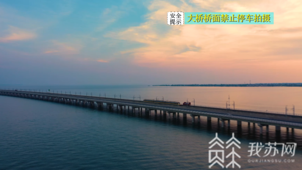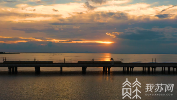 石臼湖特大桥横跨湖面,南京地铁S9号线蜿蜒而行,抓住15分钟一班的时间点,无人机上升至百米高度,捕捉列车飞驰而过的画面。