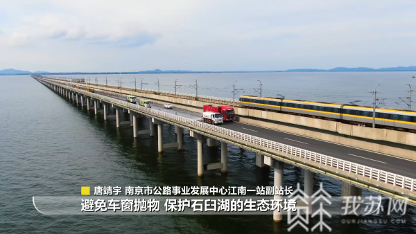 南京市公路事业发展中心江南一站副站长唐靖宇说:“我们引入科技手段,在大桥每隔一公里的地方安装摄像头。我也呼吁出行的驾乘人员,避免车窗抛物、保护石臼湖的生态环境。”