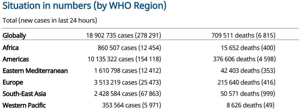 当地时间8月7日,世卫组织发布最新一期新冠肺炎每日疫情报告,全球新冠肺炎确诊病例新增278291例,死亡新增6815例。疫情最为严重的美洲区域确诊病例达到10135322例(新增154118例),死亡376606例(新增4598例)。