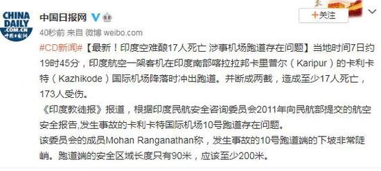 《印度教徒报》报道,根据印度民航安全咨询委员会2011年向民航部提交的航空安全报告,发生事故的卡利卡特国际机场10号跑道存在问题。