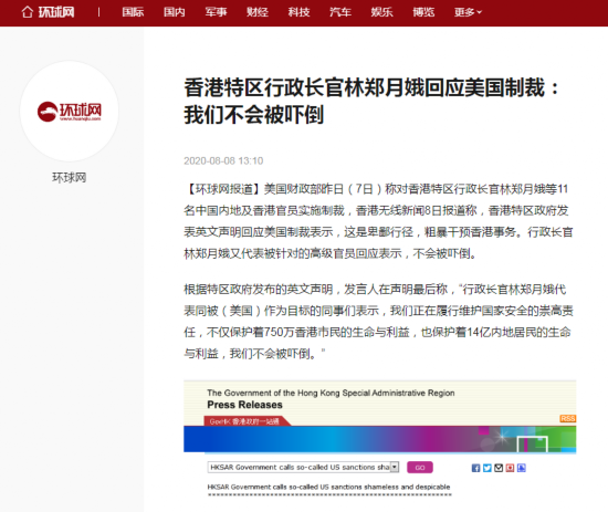 据环球网,香港特区政府发表英文声明回应美国制裁表示,这是卑鄙行径,粗暴干预香港事务。行政长官林郑月娥又代表被针对的高级官员回应表示,不会被吓倒。根据特区政府发布的英文声明,发言人在声明最后称,“行政长官林郑月娥代表同被(美国)作为目标的同事们表示,我们正在履行维护国家安全的崇高责任,不仅保护着750万香港市民的生命与利益,也保护着14亿内地居民的生命与利益,我们不会被吓倒。”