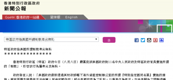 香港特别行政区(特区)政府今日(八月八日)严厉批评美国政府对11名中央人民政府及特区政府官员实施所谓的“制裁”,形容该行为属卑劣及无耻。