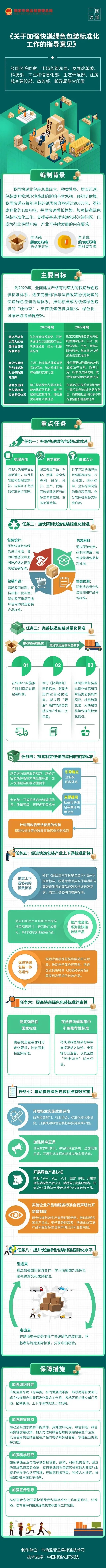 ——升级快递绿色包装标准体系。力争用三年时间,建立覆盖产品、评价、管理、安全各类别,以及研发、设计、生产、使用、回收处理各环节的快递绿色包装标准体系。