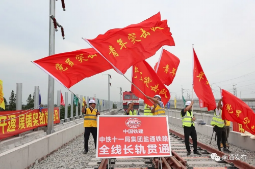 7日上午12时许,在南通西站北侧1公路处的盐通高铁施工现场,随着最后一组无缝钢轨精准铺设到位铁路正线长轨铺设全部完成,意味着在建盐通高铁正线全线贯通。