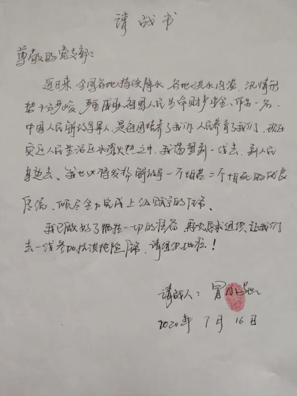 接到抗洪抢险命令后,冒小驰主动请战。