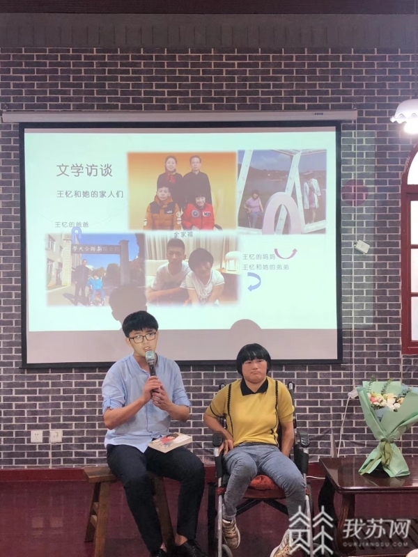 今天下午,作家王忆向读者分享了自己的成长经历和《冬日焰火》这本书的诞生过程。1989年出生的王忆,自出生就小脑瘫痪,无法行走,甚至连说话都含糊不清。但在父母和老师的帮助下,她不仅完成了九年义务教育,还凭一根手指敲打键盘,开辟了属于自己的写作天地,先后出版了散文集《轮椅上的青春》、诗集《爱,不能等》等超过100万字,并成为江苏省作家协会、中国作家协会会员、中国诗歌学会会员。中国残联主席张海迪盛赞她是“不倒的生命之树”。《冬日焰火》是王忆的首部长篇小说,也是一部自传体小说,以王忆个人的成长经历为故事核心和线索,讲述了她不断解锁自身“不可能”的故事。