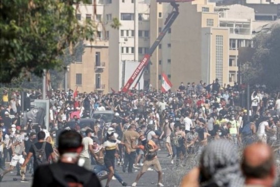 据法新社稍早前报道,当地时间8日,数千名抗议者聚集在黎巴嫩首都贝鲁特市中心,表达对政府在处理4日发生的大爆炸事故的愤怒和不满,大呼“人民要推翻政权”,称“这场毁灭整个城市并震惊世界的爆炸是黎巴嫩政府无能和腐败的直接后果”。他们向警方抛掷石块和棍棒,警方则使用催泪瓦斯进行驱散。而据英国天空新闻,黎巴嫩军方也加入警方队伍进行支援。