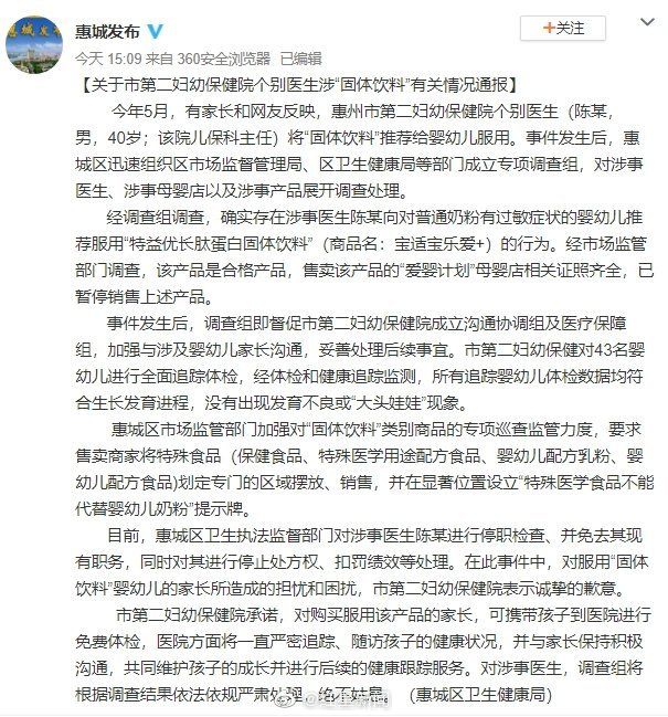 目前,惠城区卫生执法监督部门对涉事医生陈某进行停职检查、并免去其现有职务,同时对其进行停止处方权、扣罚绩效等处理。在此事件中,对服用“固体饮料”婴幼儿的家长所造成的担忧和困扰,市第二妇幼保健院表示诚挚的歉意。
