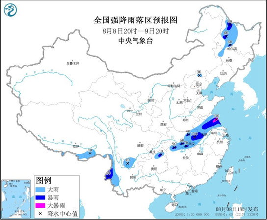 预计,8月8日20时至9日20时,黑龙江中西部、吉林西部、江苏中北部、安徽中北部、河南东南部、湖北东部和南部、湖南北部、贵州北部、四川南部、云南西部、西藏东南部等地的部分地区有大到暴雨,其中,江苏中北部、湖北东北部局地有大暴雨(100~130毫米)。上述部分地区伴有短时强降水(最大小时降雨量30~50毫米,局地可超过70毫米),局地有雷暴大风等强对流天气。