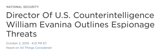 在2019年10月接受美国国家公共电台的采访中,埃瓦尼纳称中国是美国在情报领域的“头号威胁”,比俄罗斯更需要防范。