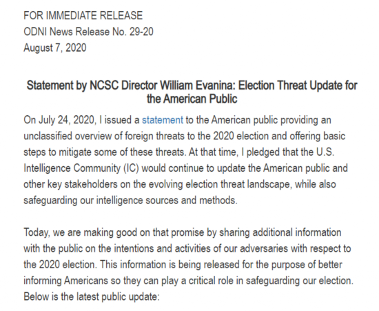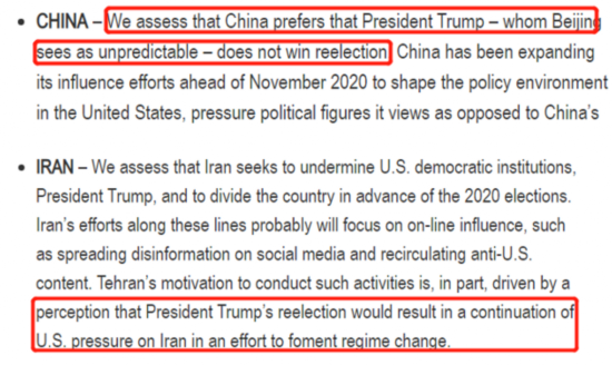 8月7日,美国国家反谍报与安全中心主任威廉·埃瓦尼纳(William Evanina)发布了一份报告,称中国、俄罗斯、伊朗在“干涉美国大选”,不过,俄罗斯在助攻特朗普,而中国与伊朗则想要特朗普输。