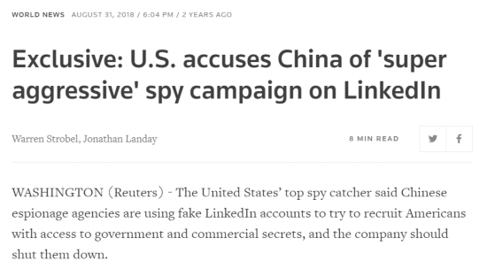 2018年8月,埃瓦尼纳曾指责中国情报部门使用“虚假”领英(LinkedIn)账户,大量“勾搭”美国涉密人员,为此,他向领英喊话要求“删除中国建的虚假账户”。但和这次的报告一样,埃瓦尼纳在所谓“领英泄密事件”的指控中,同样没有提供任何证据。