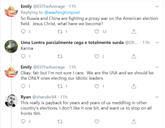 而另一个网友则感叹:“或许是美国干涉他国大选太多,现在遭报应了,我不希望我们再干(干涉他国内政)这种事了。”