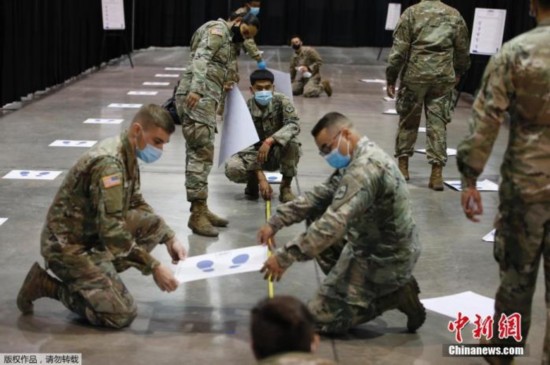 资料图:当地时间8月3日,在美国内华达州拉斯维加斯,卡什曼中心建立一处新的新冠病毒检测中心,国民警卫队员在张贴社交距离贴纸。