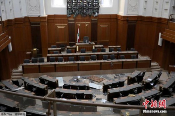 当地时间8月5日,黎巴嫩首都贝鲁特中心区,黎巴嫩议会大厅的地板上碎片散落一地。