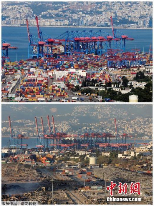 组合图片展示了2019年8月22日黎巴嫩贝鲁特港口和2020年8月5日爆炸后的景象。