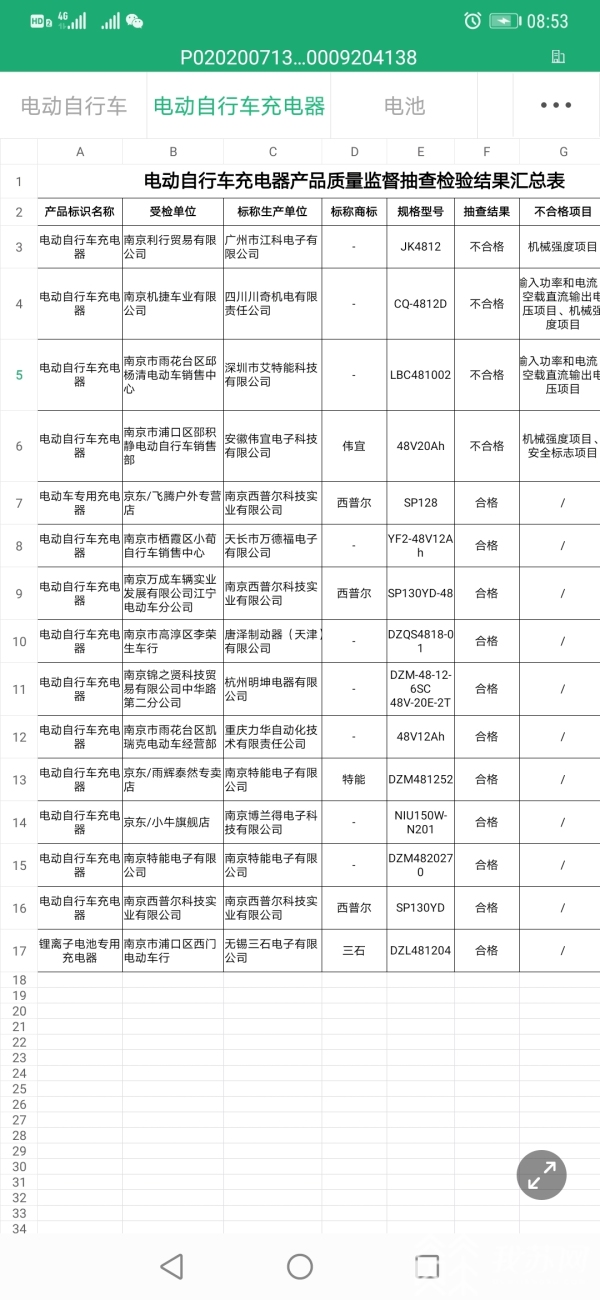 其中,位于南京市雨花台区的这家电动车销售中心,销售的一款由深圳艾特能科技有限公司生产的充电器,经检验,输入功率和电流、空载直流输出电压项目不合格。