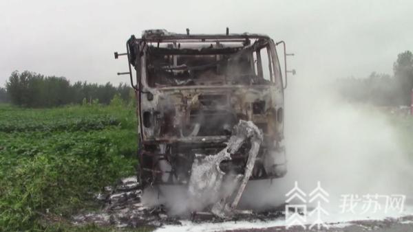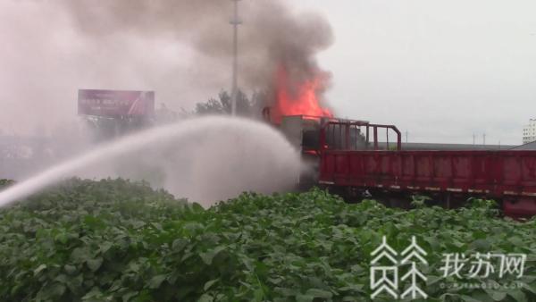 今天(8月9日)早上6点26分,淮安市涟水县119指挥中心接到报警称,在涟水县炎黄大道高速收费站附近有一辆货车起火,接到报警后安东消防站出动1车6人前往处置。