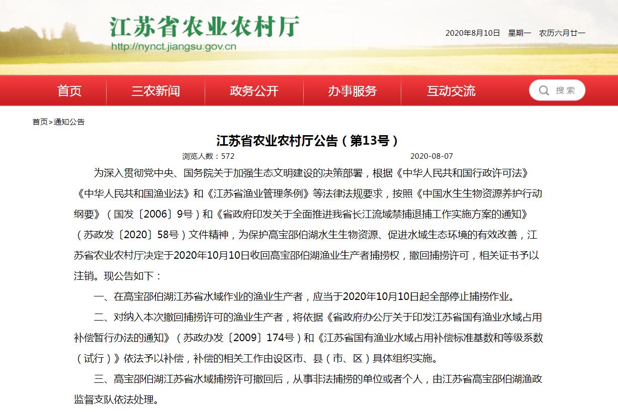 《公告》明确:在高宝邵伯湖江苏省水域作业的渔业生产者,应当于2020年10月10日起全部停止捕捞作业。