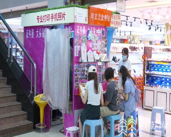 这家照相店,其实是个不足5平米的小小摄影棚,位于南京玉桥商场A区三楼的电梯口。南京姑娘茹小曼今天带着从成都远道而来的朋友何静,特意来打卡。