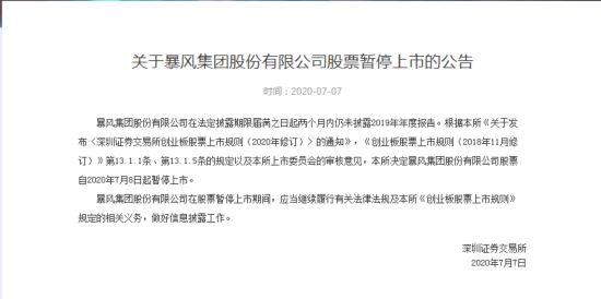 值得注意的是,7月7日晚间,深交所发布公告称,暴风集团股份有限公司在法定披露期限届满之日起两个月内仍未披露2019年年度报告。深交所决定暴风集团股份有限公司股票自2020年7月8日起暂停上市。