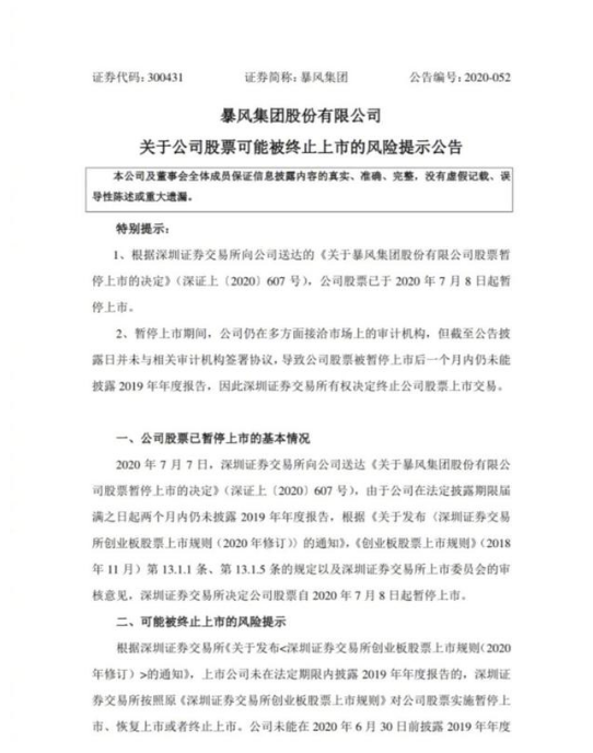 8月10日晚间,暴风集团发布公告称,公司股票已于2020年7月8日起暂停上市。暂停上市期间,公司仍在多方面接洽市场上的审计机构,但截至公告披露日并未与相关审计机构签署协议,导致公司股票被暂停上市后一个月内仍未能披露2019年年度报告,因此深圳证券交易所有权决定终止公司股票上市交易。