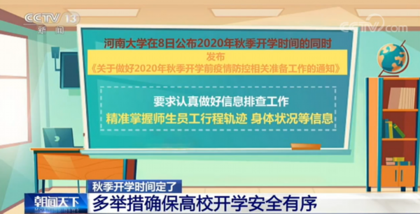 河南大学在8日公布2020年秋季开学时间的同时发布了《关于做好2020年秋季开学前疫情防控相关准备工作的通知》。要求认真做好信息排查工作,精准掌握师生员工行程轨迹、身体状况等信息。同时提醒师生员工,距返校报到时间14天内,禁止外出旅游,不与疫情中高风险地区人员接触;14天内有中高风险等级地区旅居史的人员,到校时须持有7日内核酸检测阴性证明。