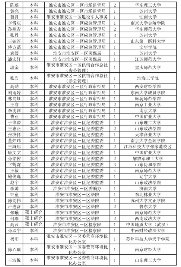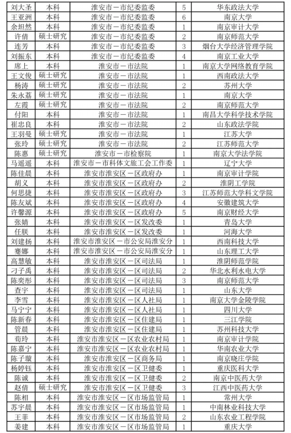 根据《淮安市2020年考试录用公务员简章》等相关规定,现将淮安市2020年考试录用公务员拟录用人员名单(第一批)予以公示,有不同意见者,请于2020年8月14日下午5:30前,电话、署名书信或当面反映。