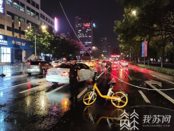 2020年8月11日19时许,南京市新街口区域暴雨如注,南京市公安局特巡警支队武装巡逻一大队民警巡逻经过洪武路天丰大厦附近时,发现一根电线从分道指示牌上垂下,占据两股车道。