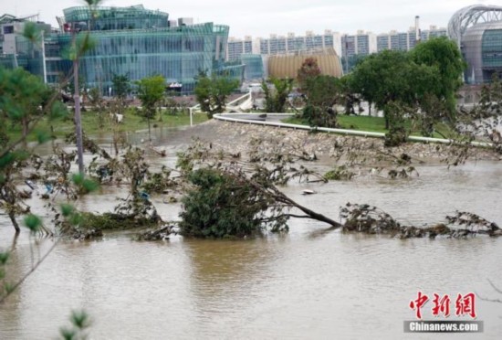 8月8日,首尔盘浦汉江公园内,多处步道、车道、停车场等被淹。连日暴雨致韩国首尔汉江水位猛增,附近部分道路、公园被淹。中新社记者 曾鼐 摄