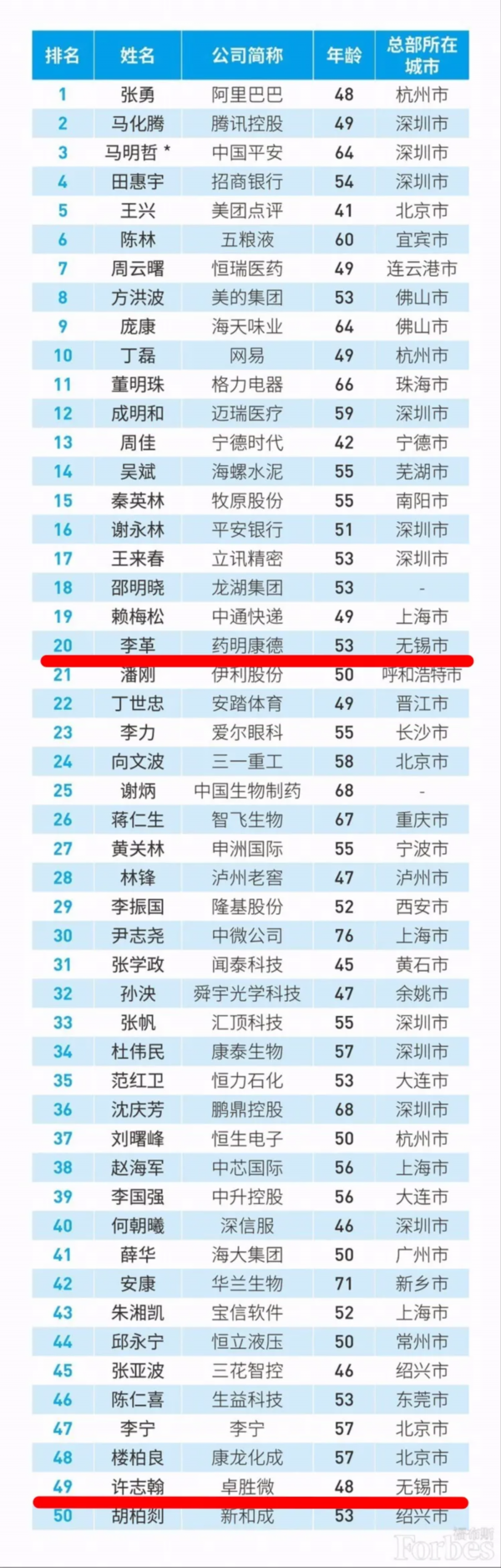 福布斯中国11日发布中国最佳CEO榜