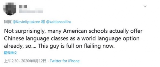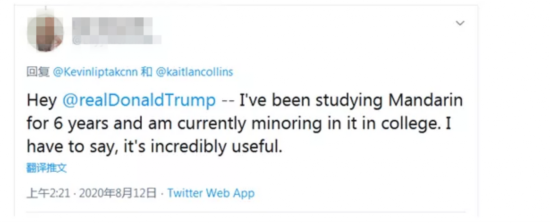 在撰写前述报道的CNN白宫记者凯文·利普塔克有关推文下方,有美国网友@特朗普:“嘿,唐纳德·特朗普,我已经学了6年普通话了,目前还在大学辅修(中文)。我不得不说,这门语言非常有用。”
