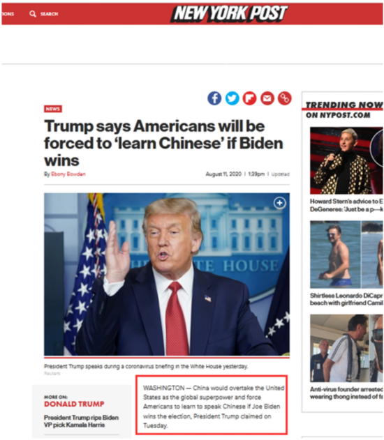 《纽约邮报》:特朗普表示,如果拜登获胜,美国人将被迫“学习中文”