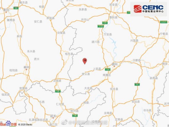中国地震台网正式测定:08月12日15时30分在江西赣州市上犹县(北纬25.90度,东经114.29度)发生3.3级地震,震源深度10千米。( @中国地震台网 )