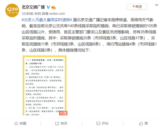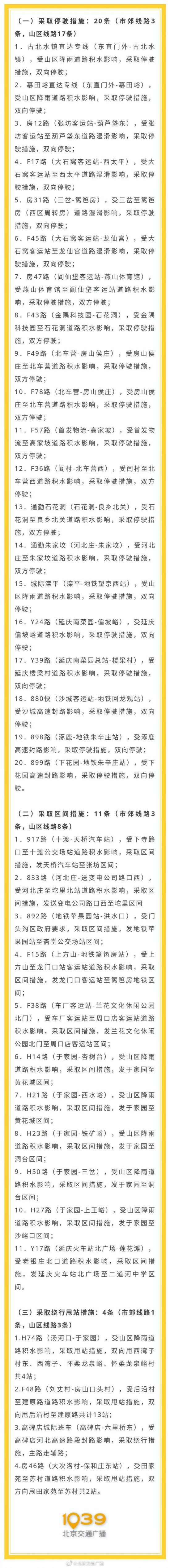 据北京交通广播记者朱艳婷报道,受降雨天气影响,截至目前北京公交共有140条线路采取临时措施,除已采取停驶措施的105条山区线路以外,受降雨、各区主管部门要求以及景区关闭等影响,另有35条线路采取临时措施,其中:采取停驶措施20条(市郊线路3条,山区线路17条),采取区间措施11条(市郊线路3条,山区线路8条),绕行甩站措施4条(市郊线路1条,山区线路3条),具体措施情况如下: