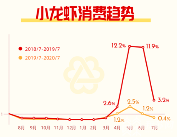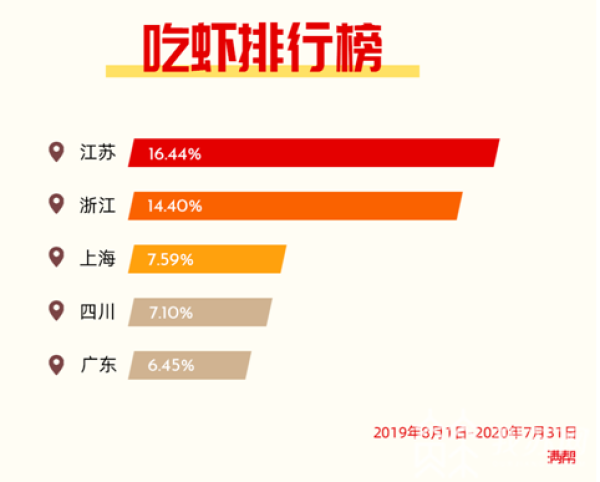2020注定是不平淡的一年,大数据显示,相较于2019年同期,今年夏季小龙虾需求增速明显放缓。往年4月小龙虾订单会出现明显增长,并于5月、6月出现“攀岩式”上浮,但今年5月至6月,平台小龙虾订单增幅出现“蹦极式”缩减,黄金5月订单增长量仅为去年同期的20%,6月降至10%。大数据显示,近一年小龙虾五大消费地区依次为江苏、浙江、上海、四川、广东。