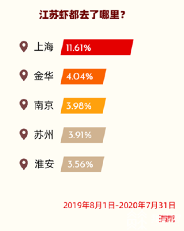 江苏不仅是“吃虾”大省,也是“产虾”大户。大数据显示,江苏小龙虾主要出现在上海、金华、南京、苏州、淮安等城市的餐桌上。有趣的数据显示,江苏运送小龙虾的师傅占比江苏司机总量的36%,同比增加64%!