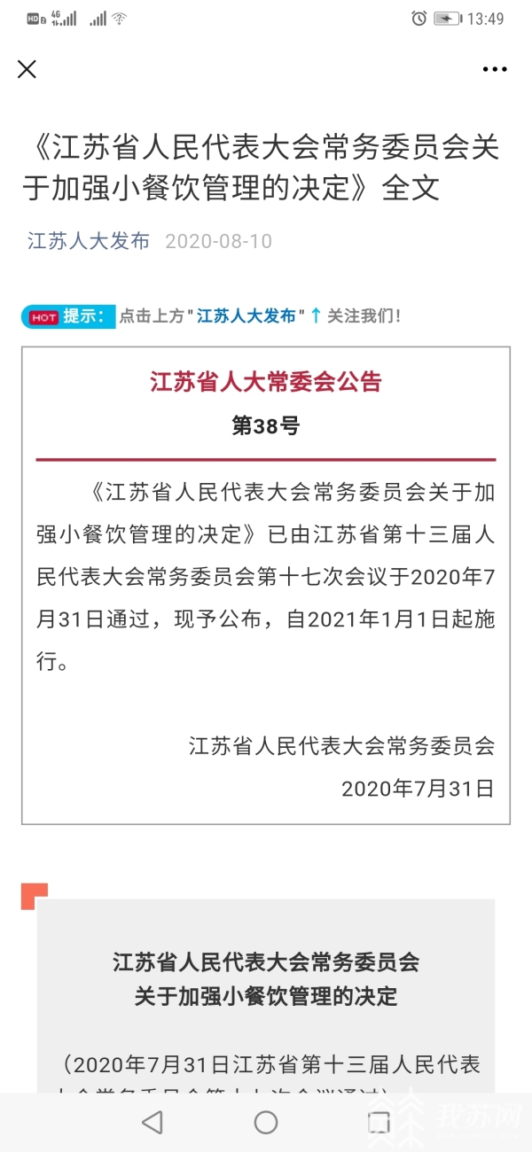 保障百姓舌尖上的安全,江苏省第十三届人民代表大会常务委员会第十七次会议通过《江苏省人民代表大会常务委员会关于加强小餐饮管理的决定》。《决定》明确提出,小餐饮不得使用生食类食品、自制裱花类蛋糕以及自制以生鲜乳为原料的饮品。