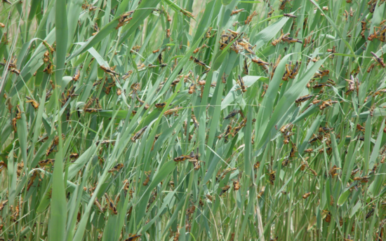 蝗灾与旱灾、洪灾并称我国历史上的三大自然灾害,曾造成严重的农业和经济损失。13日,中国科学院召开新闻发布会,介绍中国科学院动物研究所康乐院士团队在《自然》上发表的一项揭示蝗虫聚群成灾奥秘的研究成果。研究人员鉴定出飞蝗群聚的信息素4VA(4-乙烯基苯甲醚),正是它导致了蝗虫聚群成灾。